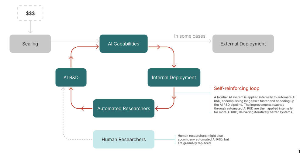 A. Hình này minh họa một vòng lặp tự củng cố (màu đỏ). Nó thể hiện cách các hệ thống AI được triển khai nội bộ được sử dụng để tự động hóa nghiên cứu và phát triển AI, ban đầu cùng với các nhà nghiên cứu con người. Các nỗ lực nghiên cứu và phát triển AI này dẫn đến một hệ thống AI có năng lực cao hơn, có thể được triển khai như một nhà nghiên cứu tự động mới và cải tiến. Vòng lặp này tiếp tục lặp lại, tạo ra một vòng lặp tự củng cố (Stix et al., 2025)