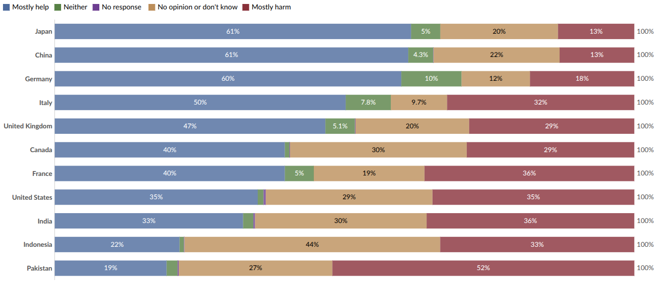 Quan điểm về tầm ảnh hưởng của trí tuệ nhân tạo (AI) đối với xã hội trong 20 năm tới, 2021. Các đối tượng tham gia khảo sát được hỏi: “Trí tuệ nhân tạo sẽ giúp hay gây hại cho con người trong 20 năm tới?” (Giattino et al., 2023).