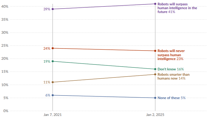 Quan điểm của người Mỹ về trí tuệ robot so với trí tuệ con người. Các đối tượng tham gia khảo sát được hỏi: “Bạn đồng ý nhất với câu nào trong số các câu sau đây?” (Giattino et al., 2023).