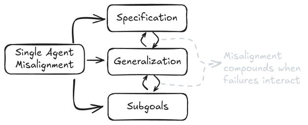 Phân tích này hữu ích để suy nghĩ về các giải pháp và nơi tập trung nỗ lực của chúng ta, vì các giải pháp kỹ thuật cho vấn đề xác định thường trông rất khác so với những giải pháp chúng ta có thể sử dụng cho các vấn đề tổng quát hóa. Vì vậy, mặc dù chúng ta sẽ thảo luận về xác định và tổng quát hóa riêng biệt, trên thực tế chúng thường tương tác và khuếch đại lẫn nhau. Chúng ta chủ yếu tập trung vào rủi ro của các tác nhân đơn lẻ để giới hạn phạm vi của chương này. Nếu bạn quan tâm đến rủi ro của các tác nhân đa lẻ, chúng tôi khuyến nghị đọc (Hammond et al., 2025).