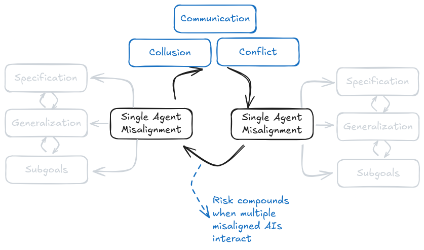 Các hệ thống được căn chỉnh riêng lẻ hoặc mất căn chỉnh có thể tương tác với nhau, tạo ra một lớp rủi ro đa tác nhân mới liên quan đến sự thông đồng, sự cố giao tiếp và xung đột giữa các tác nhân (Hammond et al., 2025).