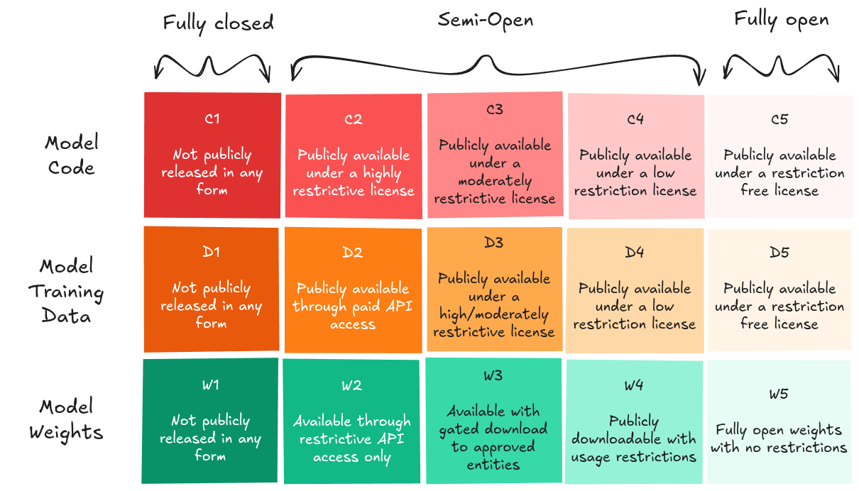 Một đề xuất về độ dốc truy cập tập trung vào cả mã mô hình và dữ liệu đào tạo (Eiras et al., 2024). Chúng ta có thể thấy các tổ hợp mức độ truy cập, ví dụ: DeepSeek-V3 có thể được coi là C5-D1 (DeepSeek, 2025).