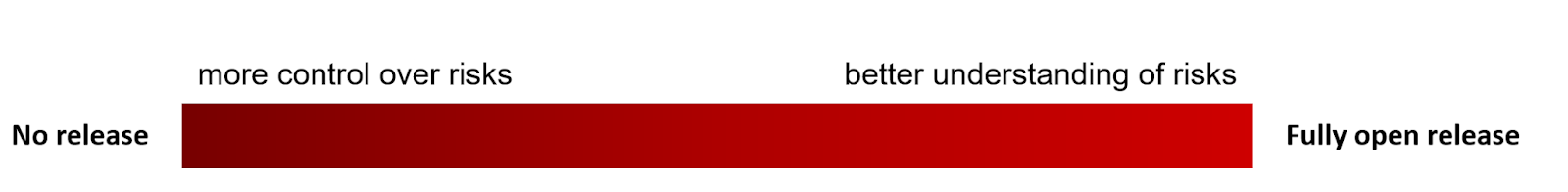 Một cái nhìn cực kỳ đơn giản về sự đánh đổi giữa việc không phát hành, có thể tăng cường kiểm soát rủi ro ngay lập tức, và việc phát hành hoàn toàn mở, cho phép hiểu rõ hơn về rủi ro trong dài hạn (Liang et al., 2022)