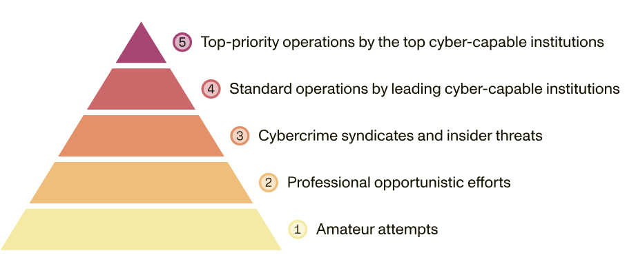 Bảo vệ trọng số (Cấp độ Bảo mật Trọng số Mô hình (WSL)) so với bí mật thuật toán Cấp độ Bảo mật Bí mật Thuật toán (SSL) đặt ra các thách thức bảo mật khác nhau. Trong khi trọng số mô hình đại diện cho khối lượng dữ liệu lớn (khiến việc rò rỉ dữ liệu tốn nhiều băng thông), bí mật thuật toán có thể được giải thích một cách ngắn gọn trong một tài liệu ngắn hoặc đoạn mã nhỏ (khiến chúng dễ bị rò rỉ qua các phương tiện truyền thống). Khả năng hoạt động (OC) cơ bản xác định mức độ phức tạp ngày càng tăng của các kẻ tấn công tiềm năng, và mức độ bảo mật tương ứng xác định khả năng bảo vệ chống lại chúng. Ví dụ, SSL1 và WSL1 tương ứng với khả năng bảo vệ mạnh mẽ (với xác suất 95%) chống lại các nỗ lực OC1 cố gắng đánh cắp trọng số mô hình AI tiên tiến (Dean, 2025).