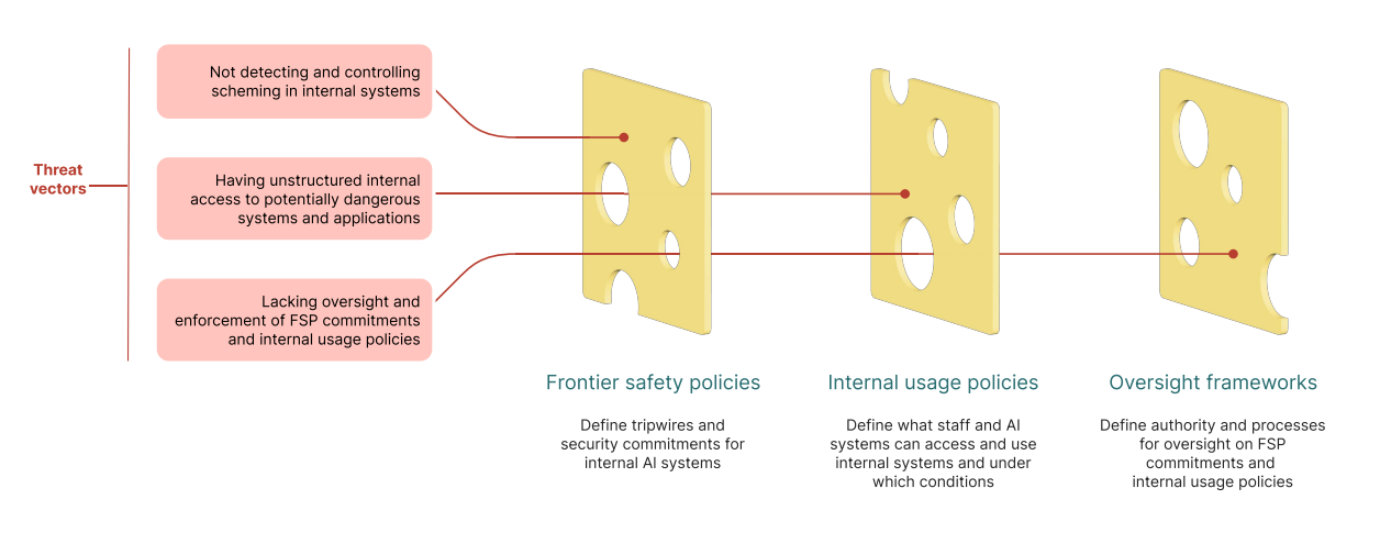 Mô hình phô mai Thụy Sĩ thể hiện chiến lược phòng thủ đa lớp mà chúng tôi đề xuất để đối phó với rủi ro mất kiểm soát do AI được triển khai nội bộ mất căn chỉnh. Các vector đe dọa được hiển thị bằng màu đỏ (Stix et al., 2025).